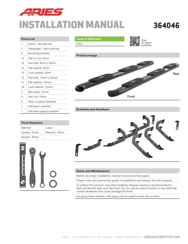 When you start and end your day turning the ignition of your truck, unreliable footing just is not an option. You need a step that can bear weight with ease, provide comfortable footing and look good doing it. ARIES 4 in. oval side bars are sleek, strong and custom-fitted to be a highly functional extension of your truck. For a variety of makes and models, 4 in. oval sides are a step up. ARIES 4 in. oval side bars are made with strong 4 in. elliptical tubing and are available in two different finish options to allow you full customization: polished stainless steel and black powder coat carbon steel. These 4 in. oval sides are a special wheel-to-wheel side bar option, constructed from high-strength carbon steel and protected with a semi-gloss black powder coat finish. They are fitted with an extra step pad and are made to span the length of your trucks wheelbase for utility purposes and an enhanced appearance. The extended step of our wheel-to-wheel side bars allows for a sturdy foothold and easy access to the truck bed. Something that sets the ARIES 4 in. oval side bar apart from all others is its blended end caps and OE-style bends. Rather than capping our side bars with a plastic cap, we offer a blended end cap for a smooth, finished appearance. ARIES 4 in. oval side bars are also fitted with raised step pads to provide a wide stepping surface. The polypropylene construction will not crack over time, and because it has a textured grip, the surface is highly resistant to slips and skids, even when wet. Installation of these ARIES 4 in. oval wheel-to-wheel side bars is quick and easy with custom-fitted mounting brackets and no drilling necessary.