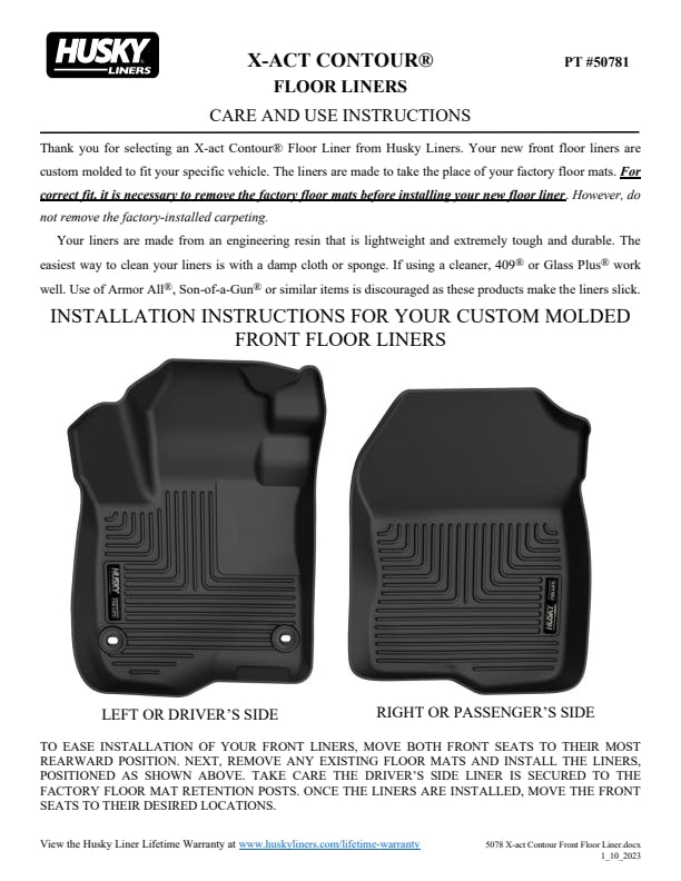 Nothing fits your vehicle better or protects longer than Husky X-act Contour?. These liners combine laser-scanned, exact fit with a no-slip, DuraGrip? surface and a softer feel. Plus, the rock-solid stability delivered by your vehicle?s factory retention posts, and our StayPut? Nibs for a no-slip, no-slide, surface with absolutely zero compromise in protection. They?re built to stand up to whatever you?re laying down? including chemicals like battery acid and oil, with our FormFit Edge? to keep whatever spills contained for easy cleanup. Available in black. Built for a lifetime of rugged abuse, warrantees the same.