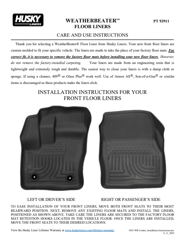 The original all-weather liner is ready, come hell or hot coffee. The Weatherbeater?s construction is a no-slip zone with zero edge curl, and its Stay Put Nibs keep it firmly anchored underfoot. It stands up to chemicals like gas, oil and battery acid, and stays tough and flexible, even under extreme temperatures. Its laser-scanned, FormFit Design? gives your truck, van or SUV an ultra-clean look with easy cleanup to match, while its patented, FormFit Edge? keeps spills contained, carpets unstained. It?s unbeatable Husky protection for life, warrantied the same. Proudly made in the USA.